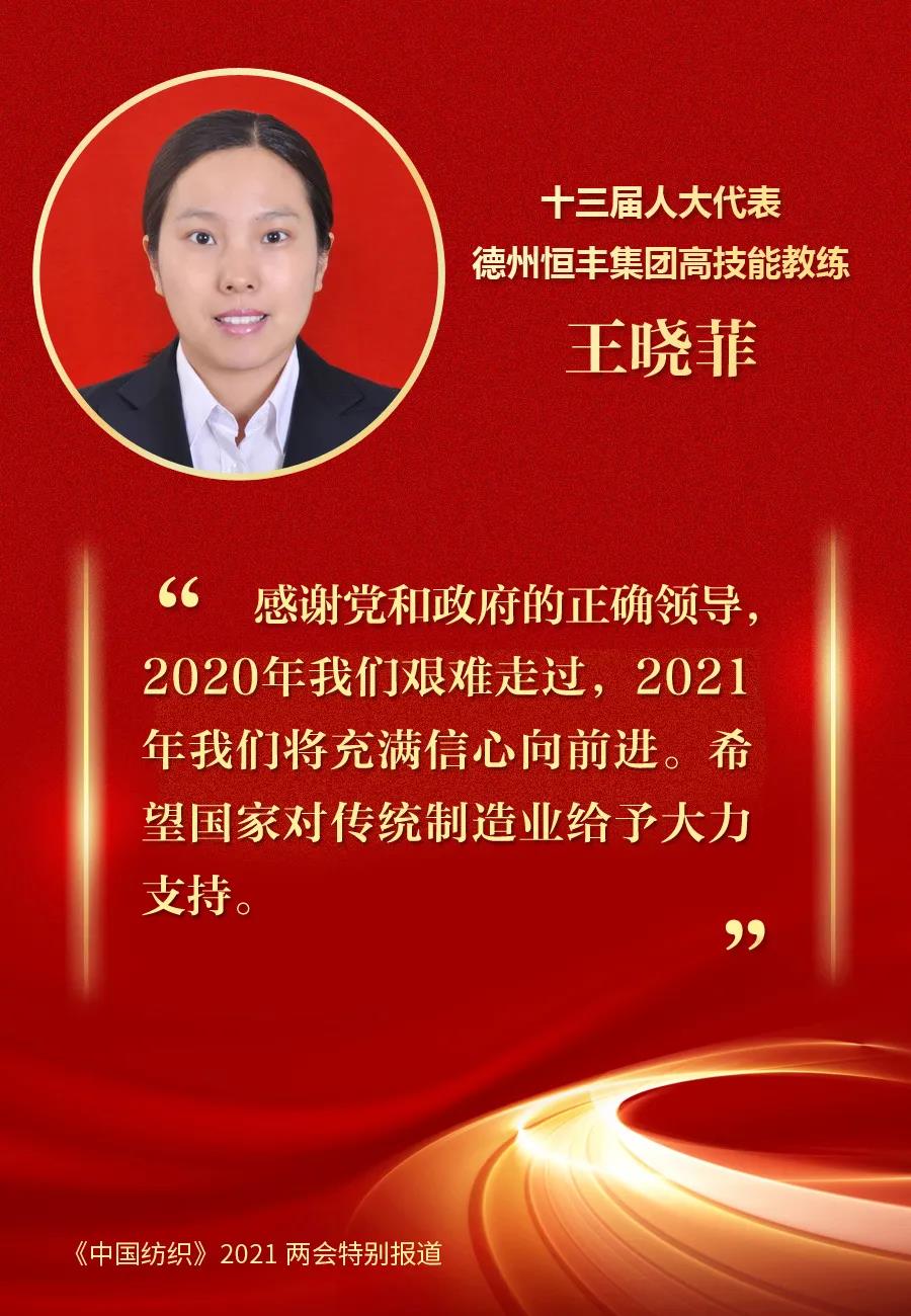 作為一名來自紡織生產(chǎn)一線的工人代表,王曉菲特別關(guān)注支持實(shí)體經(jīng)濟(jì)發(fā)展、加速傳統(tǒng)產(chǎn)業(yè)轉(zhuǎn)型升級等方面的信息。王曉菲表示:“我要充分發(fā)揮代表職能,深入開展調(diào)研活動,代表一線工人發(fā)聲,積極反映基層一線訴求。”每一年,王曉菲都有相關(guān)的提案或者建議帶上兩會。王曉菲告訴記者,去年她提出的“關(guān)于完善促進(jìn)紡織行業(yè)穩(wěn)定發(fā)展的建議”(第8937號答復(fù))收到了來自財政部、銀保監(jiān)會、司法部三個部門的分別答復(fù)。其中財政部對王曉菲提出的“關(guān)于加大減稅降費(fèi)政策力度”給出答復(fù):“2020年上半年全國累計(jì)新增減稅降費(fèi)超1.5萬億元,有效對沖了疫情影響,對紓解企業(yè)困難,支持復(fù)工復(fù)產(chǎn)和經(jīng)濟(jì)平穩(wěn)運(yùn)行發(fā)揮了重要作用,包括紡織業(yè)在內(nèi)的廣大市場主體稅費(fèi)負(fù)擔(dān)均得到顯著減輕。下一步財政部將會同有關(guān)部門繼續(xù)落實(shí)落細(xì)各項(xiàng)減稅降費(fèi)政策措施,把改減的稅減到位,該降的費(fèi)降到位,使企業(yè)切實(shí)享受到政策紅利。”