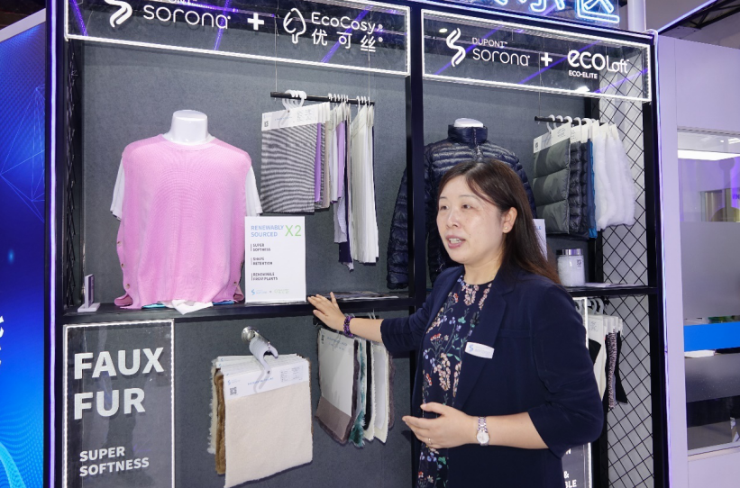 翁經理還為記者介紹了展會上展出的一些全新的產品,也是他們此次的創新產品!斑@是我們的一條新產品線,是以SORONA®為材料的人造毛皮,所以,我們根本沒使用真動物毛皮,也可以制作出柔軟親膚、外觀美麗的毛皮面料。另一條新產品線是用SORONA®和再生聚酯纖維制成的保暖材料,用于仿羽絨的填充,不僅保暖值高,還具有更強的可持續發展理念!贝送猓虐罟疽查_始更多地涉足鞋類面料應用開發,這樣鞋面針織部分可以有更好的彈性回復性,讓消費者有更加舒適的運動體驗。同時,也和其他優秀的材料企業合作,如賽得利公司,用他們的環保型粘膠纖維優可絲®和SORONA結合,生產出柔軟親膚且更具功能性的高品質面料。