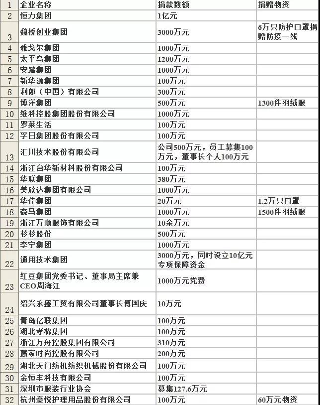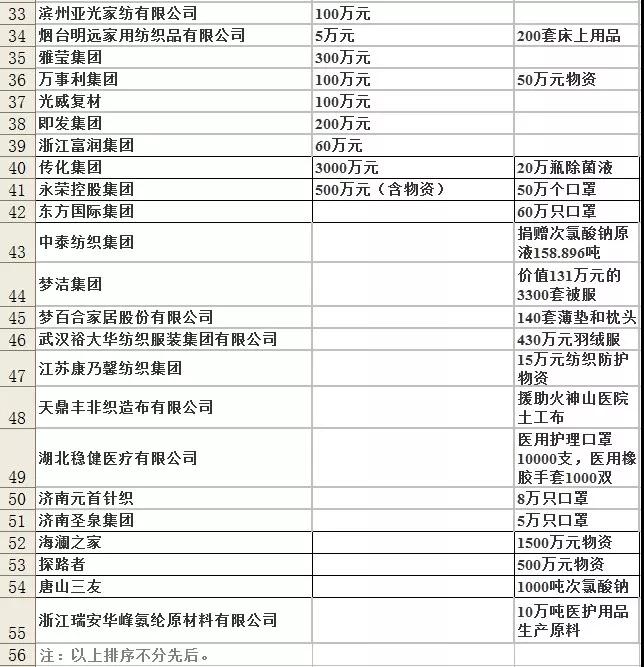 有愛不懼風來急,風雨過后是晴天。防控疫情,還有很多工作有待完善,還有很多困難需要克服,還有不少問題亟待解決,這是不容回避的事實。但我們有理由相信,只要社會各界同心同德,科學、有序地迎戰疫情,我們就能夠打贏這場沒有硝煙的戰爭。本刊記者整理了截至目前紡織企業捐款捐物情況,但條件所限,統計數據未能全面反映紡織服裝行業及企業為此次抗疫所作的貢獻,疏漏之處敬請諒解,也希望讀者能夠積極為我們提供相關信息。(見文末)