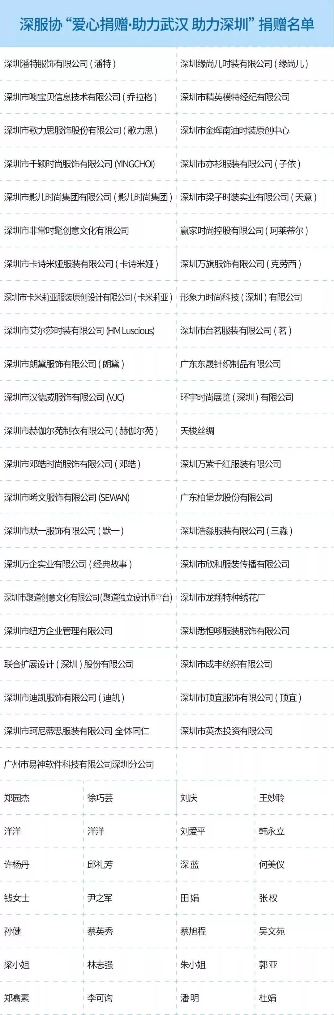 1月31日,愛心企業贏家時尚控股有限公司(3709.hk)通過深圳市花樣盛年慈善基金會對接,向深圳市慈善會捐贈人民幣200萬元,為“共抗疫情,馳援湖北,守護廣東,保障深圳”盡一份社會責任。捐贈善款由深圳市慈善會在深圳防疫指揮下統一調配,一部分用于湖北防疫工作的物資采購支持,一部分用于廣東省地區的防疫工作相關支出,主要用于為醫務人員采購防護醫用品,為社區易感人群采購防護工具,為公共生活區和辦公區消毒防護等支出。病毒無情,南商有愛!1月31日中午12點,南海區鹽步內衣行業協會發出《眾志成城抗擊疫情的捐贈倡議書》,獲得了各內衣企業的踴躍支持。截至2月1日早上9:30,距發出倡議的通知僅21小時,鹽步內衣協會已經籌集到資金221899.99元和一批防疫物資,捐款活動還在持續進行,預計捐贈的現金及物資貨值將達40萬元。