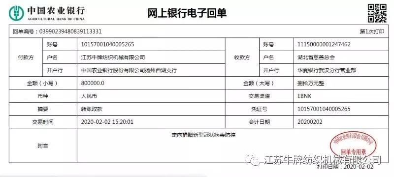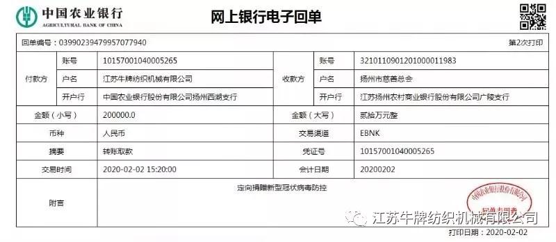 牛牌紡機決定向湖北省慈善總會捐贈人民幣80萬元,向揚州市慈善總會捐贈人民幣20萬元,定向用于抗擊新型冠狀病毒疫情。以表達牛牌人的善意和愛心,為抗擊新型冠狀病毒疫情盡一點綿薄之力。