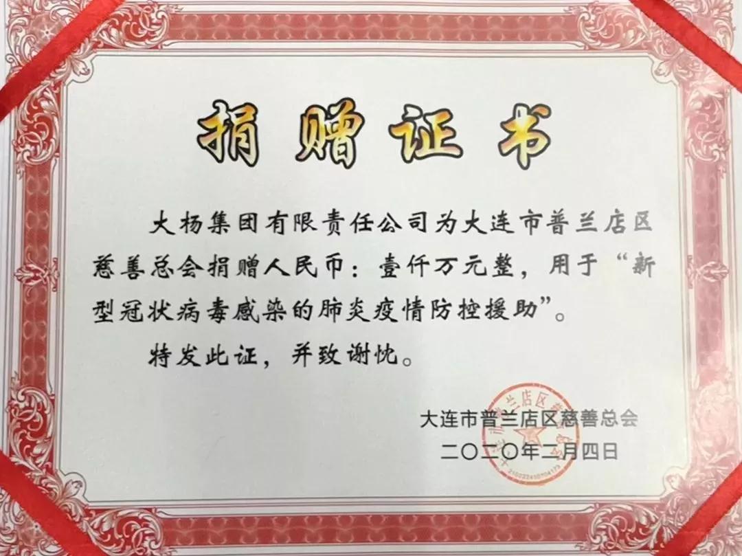 新型肺炎疫情的爆發,牽動著每一名中國人的心。面對疫情,大楊集團義不容辭地承擔起大企業的社會責任與擔當,于2月4日下午向大連普蘭店區慈善總會捐贈1000萬元,成立“大楊集團防控新型肺炎疫情專項基金”,助力疫情防控。