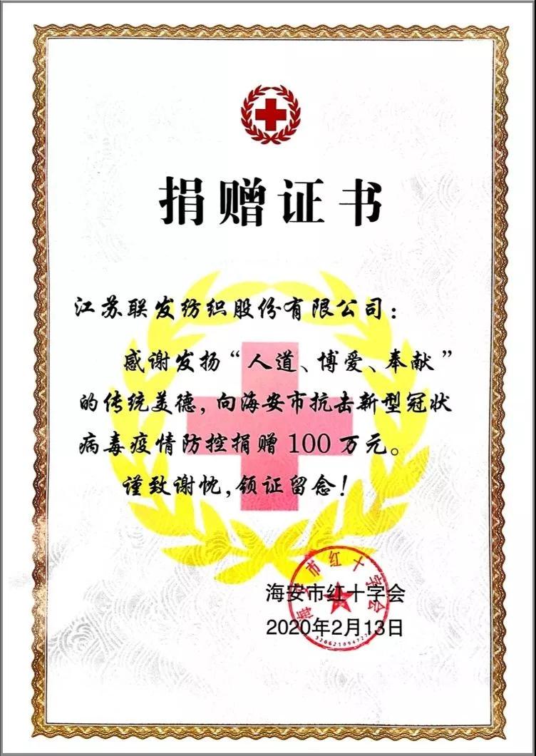 打贏疫情阻擊戰,是黨中央向全黨全國人民發出的動員令。疫情的發展和同胞的安危,時刻牽動著江蘇聯發紡織股份有限公司全體員工的心。 為全力支持湖北疫情防控工作,攜手打贏疫情防控阻擊戰,江蘇聯發紡織股份有限公司立即響應號召、迅速行動,在投入大量人力物力聚焦疫情防控和復工復產的雙重任務的同時,中共江蘇聯發黨委向全體員工發出“奉獻一片愛心,貢獻一份力量”的倡議,積極組織為湖北疫情防控捐款活動,表達聯發股份全體職工對湖北人民的深厚情誼和對疫情防控工作的堅定支持。 截至2月13日,江蘇聯發股份有限公司已通過海安紅十字會向武漢地區捐款100萬元,全體職工向海安慈善總會捐款86.129萬元,專門用于新冠肺炎的防治。旗下南通聯發天翔印染有限公司生產的優質皮卡丘和胖丁系列家紡產品溫暖著武漢方艙醫院里的患者。