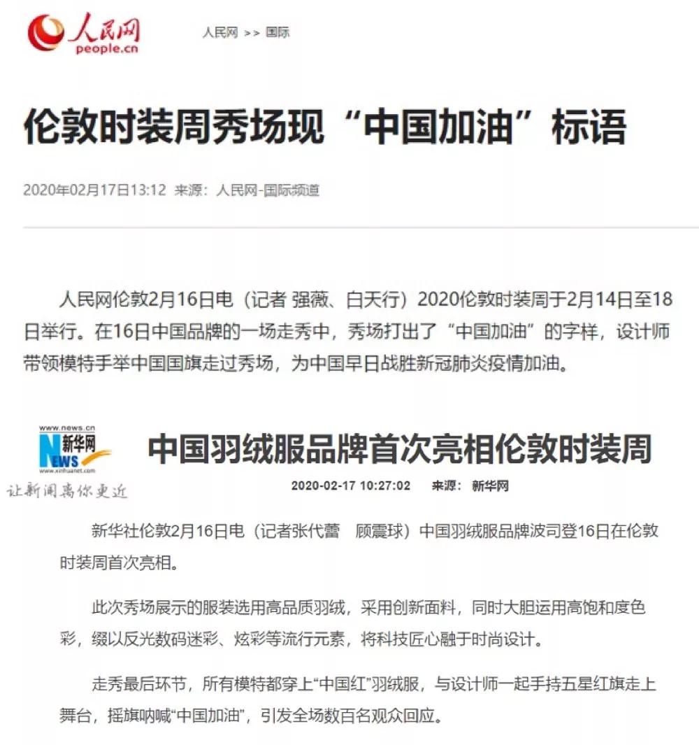 人民網、新華網等主流媒體,對波司登在倫敦時裝周引發的世界友人為中國加油熱潮進行了報道。