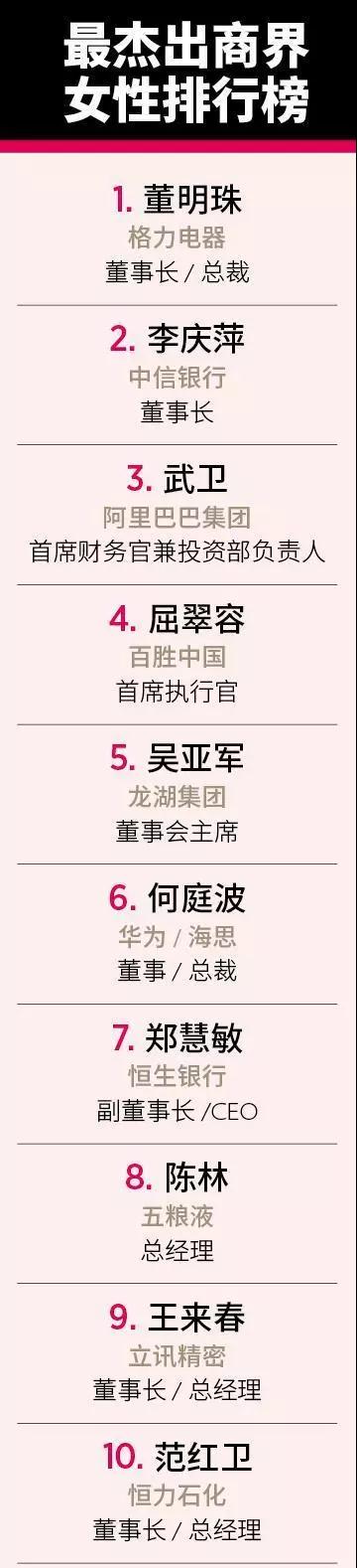 與往年相比,今年的榜單出現了許多新面孔,近1/4上榜者來自TMT行業,這其中包括被媒體稱為“芯片女皇”的華為董事、海思總裁何庭波,排名第六。海思芯片目前是國內最大的半導體公司,全球芯片設計排名第五。此外,金融、房地產、醫藥行業上榜人數也較多。