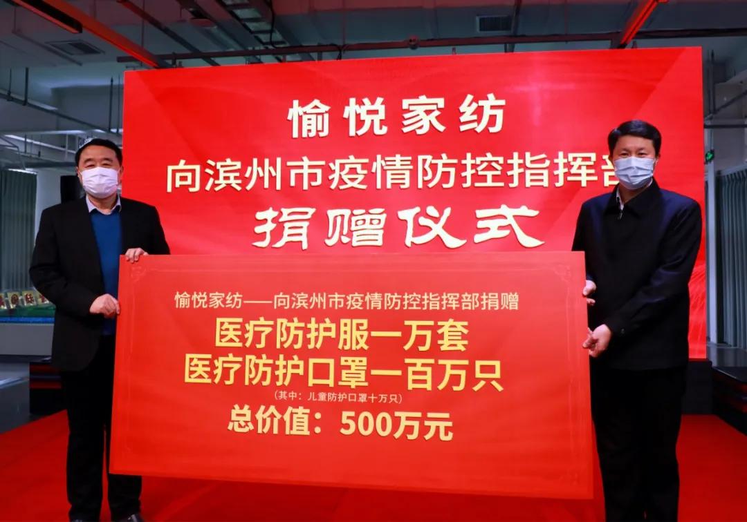 今后,愉悅的品牌將是一個融合了紡織家紡、醫養健康、循環經濟、電子信息、新材料等N多行業跨界融合的新物種,將是一個具有自我完善、生長能力的生命體。 2月26日上午,愉悅家紡有限公司向濱州市疫情防控指揮部捐贈價值500萬元的防疫物資,強力支援全市的疫情防控工作。這批防疫物資包含1萬套醫用防護服和100萬只防護口罩。 市委書記、市人大常委會主任佘春明出席捐贈儀式并致辭;市委常委、秘書長張延廷主持儀式;愉悅家紡黨委書記、董事長劉曰興代表公司捐贈防疫物資,市委常委、常務副市長張寶亮代表指揮部接受捐贈。 據悉,愉悅家紡捐贈的這批防疫物資包含1萬套醫用防護服和100萬只防護口罩(含10萬只兒童防護口罩)。相關產品全部產自公司旗下大健康產業的無菌制造車間,是地地道道的“濱州制造”、“愉悅生產”。 自疫情發生以來,愉悅家紡立足自身“家紡紡織”和“大健康”雙產業鏈優勢,開足馬力增產、轉產各類防疫物資,全力支援疫情防控。公司生產的醫用防護服、防護口罩、無菌注射器、輸液器、外科紗布敷料、醫用脫脂棉、醫用脫脂棉紗布等近二十種防疫物資,源源不斷送往戰疫前線,成為最美逆行者的“堅強護盾”,也為千家萬戶送去一份健康防護。 此外,在此次防疫狙擊戰中,愉悅家紡還貢獻了一項革命性的“硬核”科技。公司攻關團隊成功研發的“納纖膜”新材料,利用納米級的靜電紡絲技術,實現了超高過濾和超低氣阻完美融合,對細菌、病毒及各種顆粒物的過濾效果遠超傳統熔噴無紡布,不僅能廣泛應用于防護服、口罩等醫療防護領域,在皮膚再生、生物傳感、生物工程支架等生命健康領域同樣前景廣闊,有望掀起一場健康材料的革命。