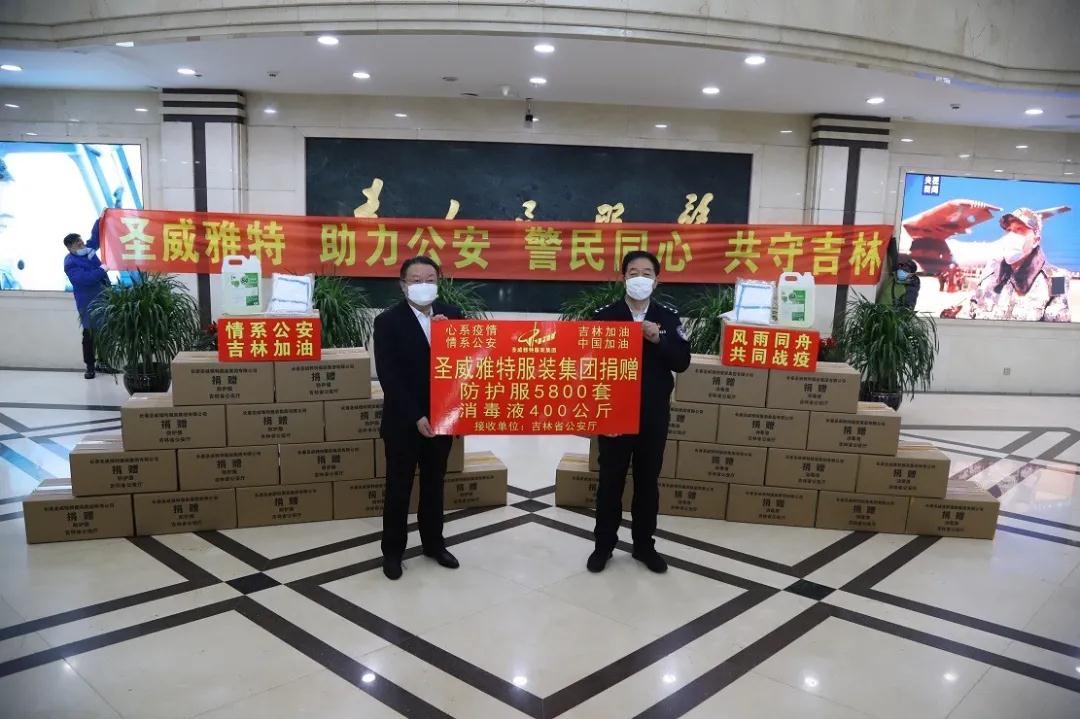 長春圣威雅特向吉林省公安廳捐贈防疫物資 3月2日,長春圣威雅特服裝集團有限公司向吉林省公安廳捐贈防護服、消毒等應急防疫物資。吉林省公安廳二級巡視員孫全興代表省公安廳接受捐贈。吉林省公安廳警務保障部有關負責同志參加捐贈儀式。 自疫情防控工作開展以來,吉林省公安民警始終奮戰在防疫一線,不畏風險,不辭辛苦,全力守護社會穩定平安。