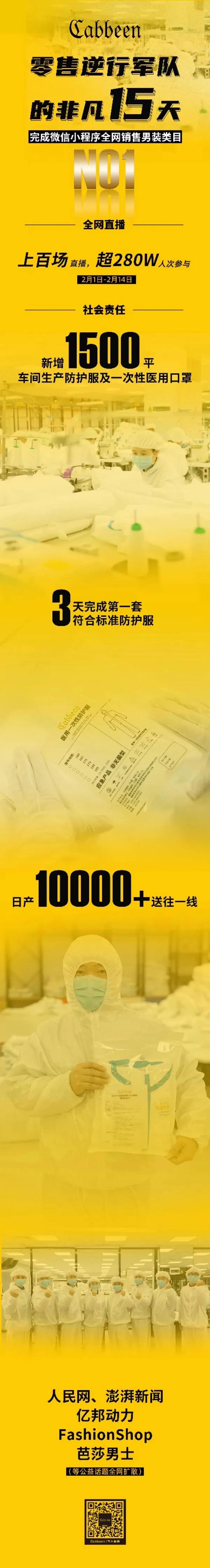 《中國紡織》:在迅速轉產支持抗疫的同時,作為卡賓的核心板塊——服裝板塊將如何應對? 楊紫明:Cabbeen卡賓擁有23年的發展歷史及良好商譽,有足夠的資源籌備及預案來面對突發情況。首先,本著員工第一的原則,公司不會進行任何方式的裁員,保障員工的利益,同時,對于合作伙伴和加盟商我們都有出臺相應政策進行扶持,穩定軍心。 至于營銷策略上,早在疫情前,我們布局2020年策略時,新零售項目已成為Cabbeen卡賓今年重點的發展戰略。在疫情突然爆發,我們意識到嚴重性,加快推進策略執行。2020年2月3日-10日,當全國又一次延長新年假期,零售再次深受重擊之時,Cabbeen卡賓已完成單品牌日銷200萬業績。同時段開通社群及分銷策略,實現全國在線銷售服務。在保證客群滿意度情況下,不降低品質的非降價也不進行惡意降價打擊市場正常銷售環境下,取得男裝品類微信小程序銷售全國第一。