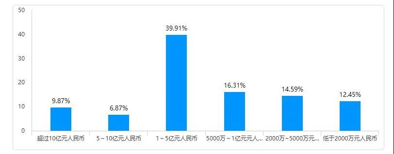 本次調查中240家企業提交問卷,其中有效問卷233份。有效樣本企業來自醫療衛生、安全防護、非織造布卷材、過濾與分離、線帶、軍民融合、纖維原材料、繩網、裝備及配件等領域,涉及產業用紡織品的整個產業鏈條。 數據來源:中國產業用紡織品行業協會樣本企業2019年的主營業務收入(企業規模)主要集中在1~5億元人民幣,占總量的近40%,近10%的企業超過10億元人民幣,12.45%的企業是規模以下企業。 數據來源:中國產業用紡織品行業協會