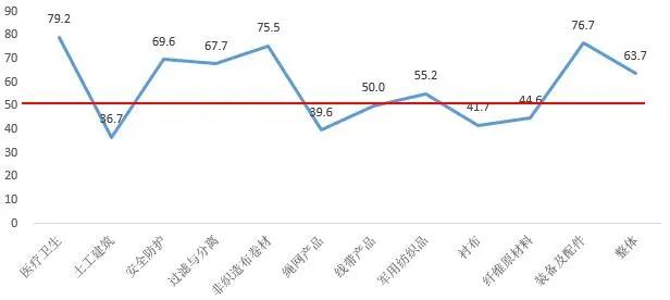 對于一季度企業的經營情況,11.16%的企業表示非常好,30.47%的企業表示比較好,38.63%的企業表示一般。近20%的企業表示經營情況不好,其中近4%的企業表示非常差。將經營情況指數化處理,一季度行業的景氣指數63.7,醫療衛生、安全防護、過濾與分離、非織造卷材、裝備及配件領域的景氣度較高,其中從事抗擊疫情物資生產的醫療衛生領域的景氣指數達到79.2,而土工建筑、繩網、襯布等領域的景氣指數在榮枯值(50)以下。(樣本數低于10的領域不顯示)