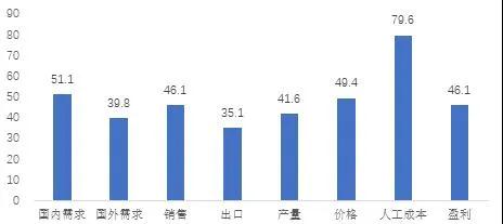 樣本企業中只有一家未復工。94%以上的企業員工返崗率超過75%,其中77.68%的企業員工已全部返崗。行業的產能恢復情況比較理想,47.21%的企業已經滿負荷生產,36.05%的企業產能恢復至80%(以上兩部分企業占83.26%),10.3%的企業產能恢復至60%。 數據來源:中國產業用紡織品行業協會一季度行業人工成本上漲較快,海外需求和出口降幅較大。一季度行業的國內市場需求指數51.1,依然處于比較弱的擴張區間;國外需求和出口指數分別只有39.8、35.1,產量指數41.6,均處于收縮區間;產成品價格指數49.4,基本保持穩定;人工成本指數79.6,處于大幅上升的區間;銷售指數和盈利指數均為46.1,處于收縮區間,但幅度不大。 數據來源:中國產業用紡織品行業協會