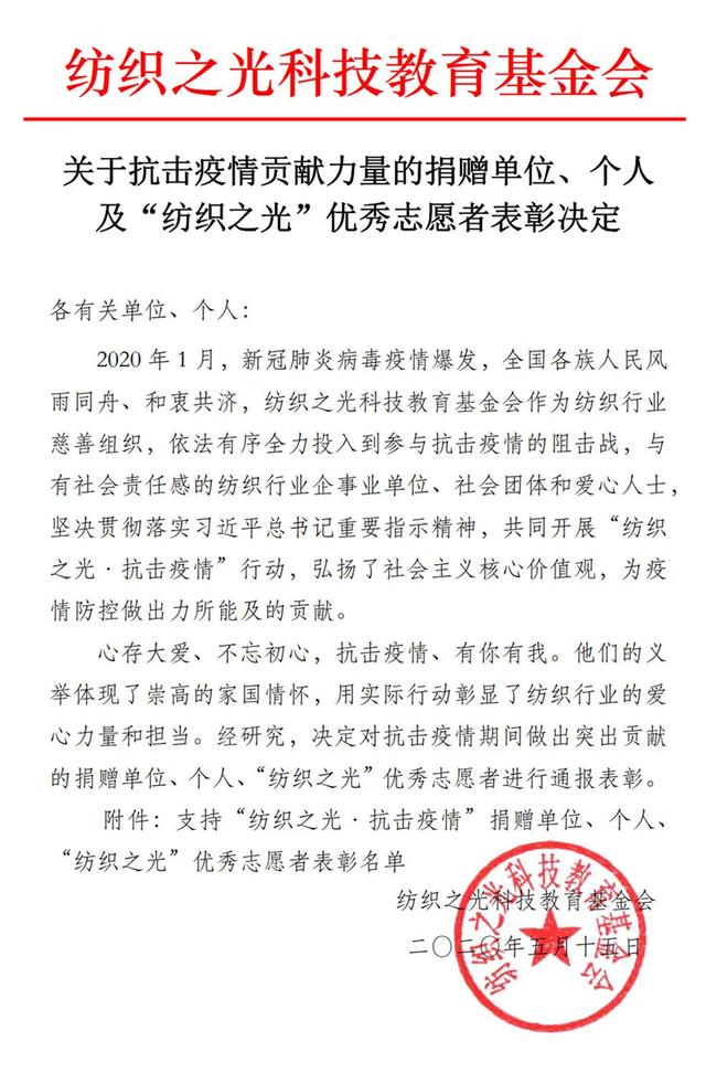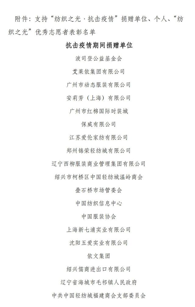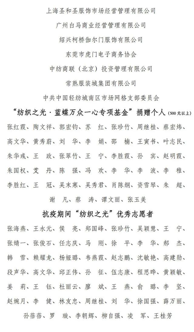 會議還對抗擊疫情期間的“紡織之光·藍蝶萬眾一心專項基金”捐贈人、“紡織之光”優秀志愿者進行了表彰。
