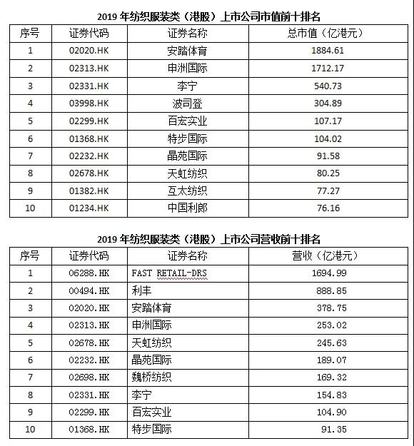 2019年度香港股市紡織服裝上市公司發展的基本情況主要有:2019年香港股市受全球市場環境影響,指數跌宕起伏,個股分化嚴重。截至2019年末,港股共計2449家上市公司(其中主板2017家,創業板378家),總市值38.06萬億港元,比2018年港股總市值增加8.15萬億港元,漲幅27.25%。其中,以紡織服裝為主營的香港上市企業約106家,在香港上市企業中的占比約4.33%;總市值6131.48億港元,占香港股市市值的1.61%。此外,2019年香港股市共有163家企業首發上市,紡織服裝類新上市企業10家(占比6.13%),較上年度增加了3家。主要表現為:2019全年近半數企業營收實現了正增長;公司盈利能力與質量均有所下降;資產規模進一步擴大,負債率有所上升,運營情況略遜于上年度;現金流量整體情況較上年度大有好轉。其中,共有5家紡織服裝類港股獲得21.89億港元配售募資。