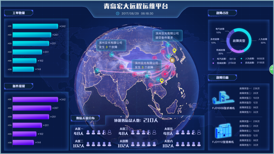 面對當前紡紗企業技術力量薄弱的痛點需求。青島宏大對癥下藥,于2017年創建了“制造+遠程運維”智能化服務新模式平臺。該平臺能夠幫助客戶快速解決設備故障,提高生產效率,及時解決用戶設備保養和保全問題,提高經濟效益。該項目入選“2017年山東省智能制造試點示范項目”,也讓青島宏大成為山東省唯一入圍的紡機制造企業。