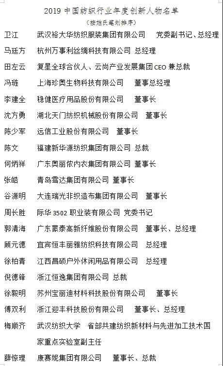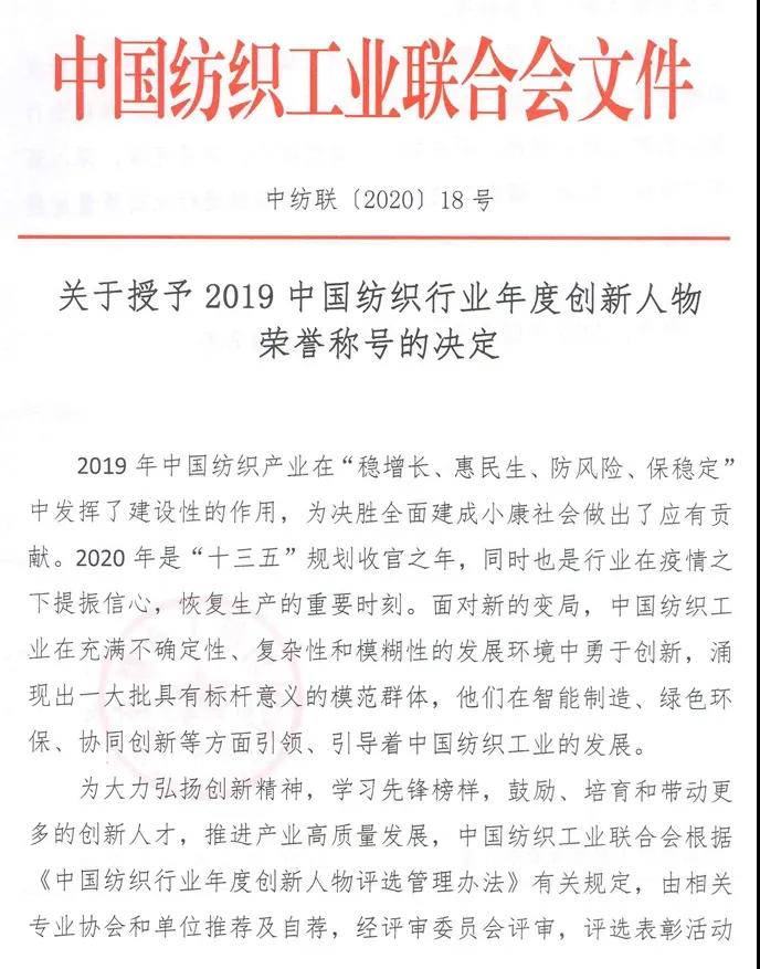中國紡織工業聯合會黨委書記兼秘書長高勇在會上宣讀2019中國紡織行業年度創新人物表彰決定。他指出,“中國紡織行業年度創新人物評選活動”作為中國紡織工業聯合會從2005年開始在全行業展開的一項評優推優活動,至今已推選出了200多位創新人物,是在2009年經中共中央、國務院批準同意的評比達標表彰活動。多年來,《中國紡織》雜志社作為承辦單位做了大量工作,在各有關專業協會和有關部門的積極支持和配合下,紡織行業年度創新人物評選已成為紡織行業內最具影響力和權威性的表彰活動。與此同時,被表彰的年度創新人物始終保持著創新活力,在行業內發揮著重要的榜樣示范作用,成為引領行業創新發展的中堅力量。