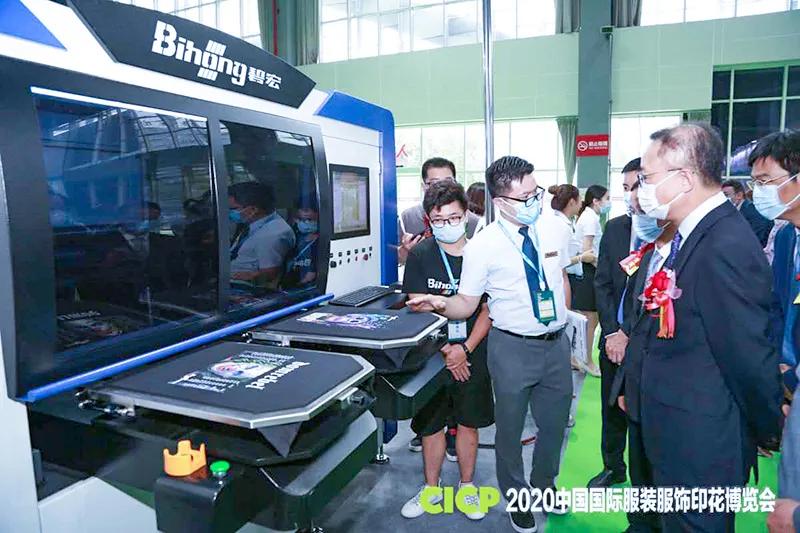 在廣東碧宏機械股份有限公司展位上,孫瑞哲一行領導饒有興致地觀看了他們最新研發的雙臺板成衣白墨直噴機打印T恤的過程。展位負責人介紹,該設備不僅可以雙工位同時打印,還可白彩同出,深受市場青睞。