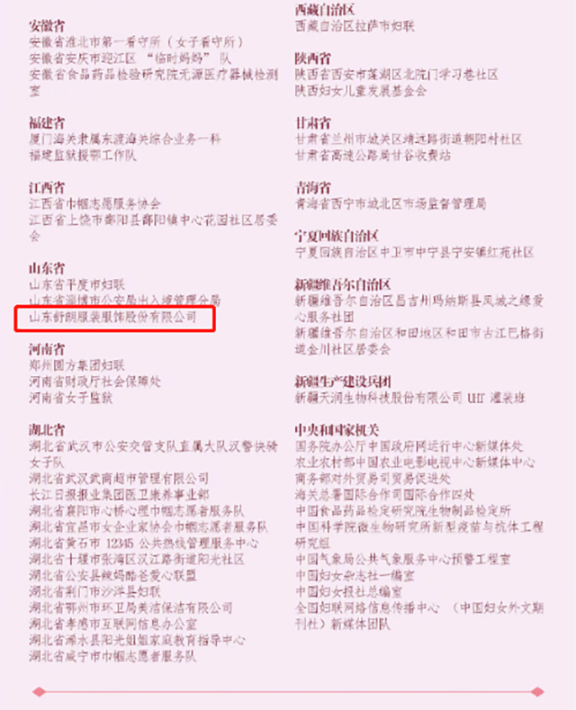 2020年9月29日,抗擊新冠肺炎疫情全國三八紅旗手(集體)表彰云發布活動上,山東舒朗服裝服飾有限公司獲得“全國三八紅旗集體”榮譽稱號。