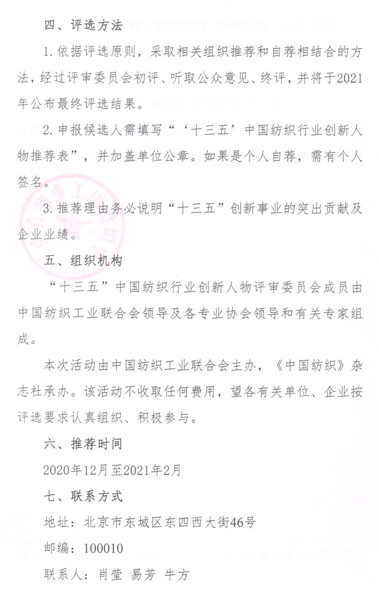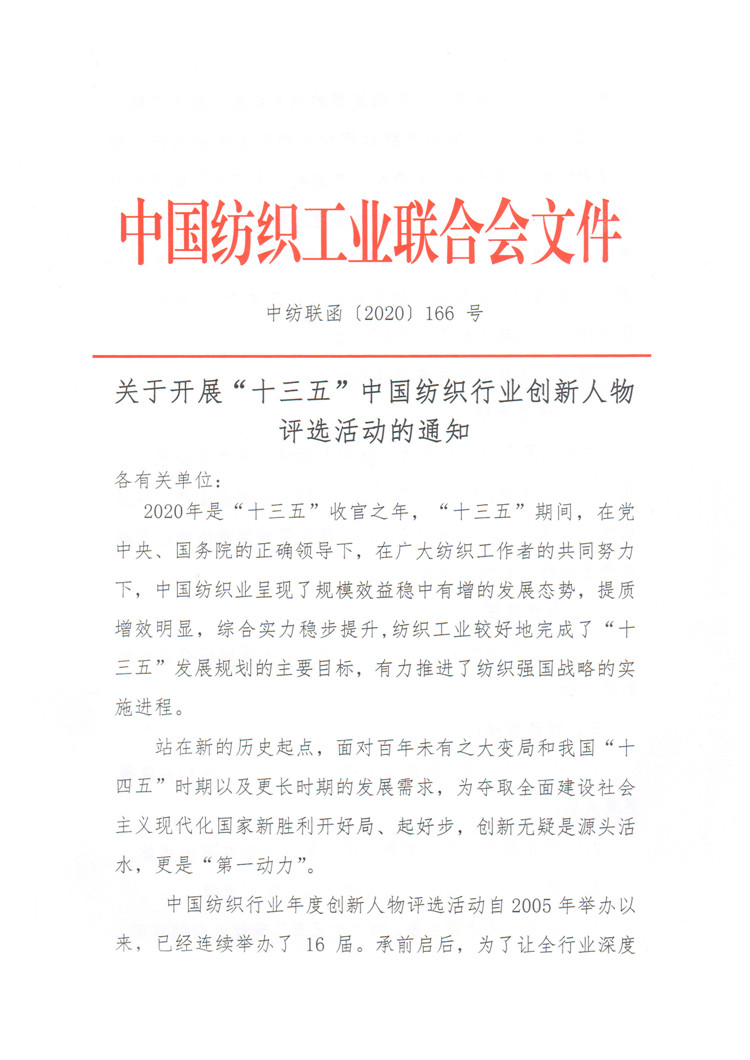 關于開展“十三五”中國紡織創新人物評選活動的通知