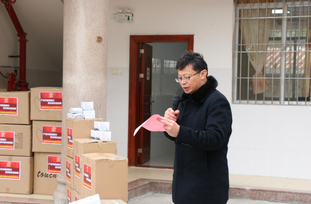 樂昌市民政局局長陳嘉強致辭,感謝曾悅副鎮長率領的大朗毛織一行為樂昌帶來的濃濃暖意。