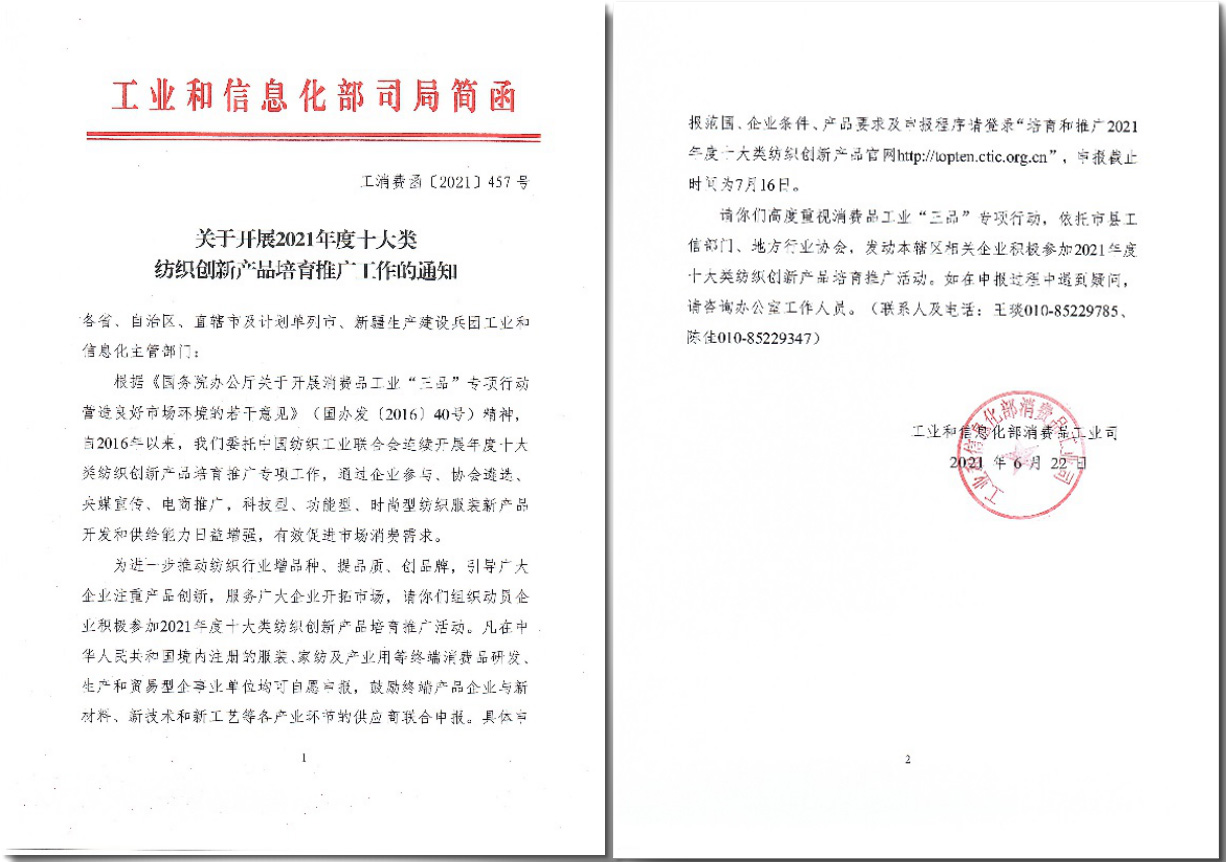 為進一步推動紡織行業增品種、提品質、創品牌,引導廣大企業注重產品創新,服務廣大企業開拓市場,工業和信息化部消費品工業司繼續委托中國紡織工業聯合會開展“2021年度十大類紡織創新產品”培育推廣活動。網上申報工作將于7月16日截止。