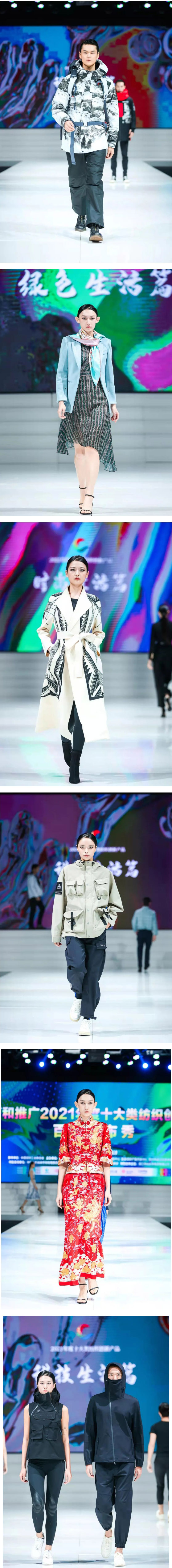 波司登的登峰系列羽絨服、探路者的女式TiEF皮膚衣、優聯捷的運動心電T恤等智能科技/舒適功能/運動功能產品,安踏的八面穿棉服、廣東名瑞的“龍鳳褂裙”刺繡婚慶禮服、江蘇華佳的After Work 家居服套裝等時尚創意/非遺創新產品,伊芙麗的零碳天絲™萊賽爾抗菌西裝、山東如意的可追溯純羊毛休閑西裝等生態環保產品逐一閃亮登場,一展實力風采。