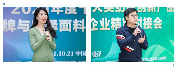 10月21日,在第十屆江蘇(盛澤)紡織品博覽會盛大舉行之際,“百品發布·百家對接”——“培育和推廣2021年度十大類紡織創新產品”頒獎典禮暨百家品牌與盛澤面料企業精準對接會在江蘇省蘇州市吳江區盛澤鎮舉辦。活動由表彰推廣、經驗分享、時尚發布、供需對接、參觀交流等多個部分組成,在展示和推廣中國紡織行業的最新創新成果的同時,還為紡織行業上下游搭建了交流與對接的高效平臺。