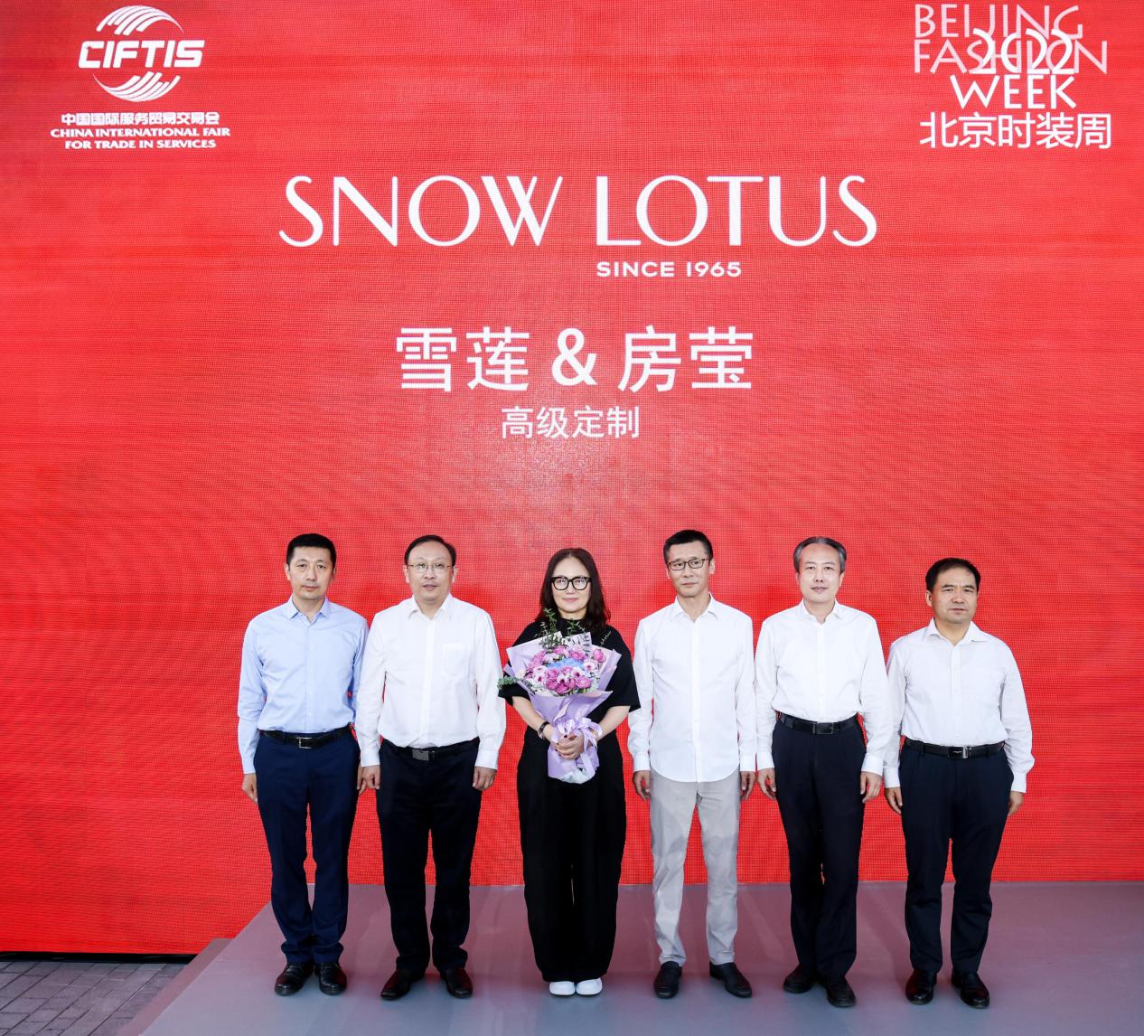 中國(guó)紡織工業(yè)聯(lián)合會(huì)副會(huì)長(zhǎng)、中國(guó)服裝協(xié)會(huì)會(huì)長(zhǎng)陳大鵬(右三),2022北京時(shí)裝周組委會(huì)主席團(tuán)主席、北京時(shí)尚控股有限責(zé)任公司黨委書(shū)記、董事長(zhǎng)顧偉達(dá)(左二),北京時(shí)尚控股有限責(zé)任公司黨委副書(shū)記、總經(jīng)理樸學(xué)東(右二),北京雪蓮集團(tuán)有限公司黨委書(shū)記、董事長(zhǎng)孟澤(左一),北京雪蓮集團(tuán)有限公司黨委副書(shū)記、副董事長(zhǎng)、總經(jīng)理甘學(xué)榮(右一)上臺(tái)與本次大秀設(shè)計(jì)師房瑩合影。