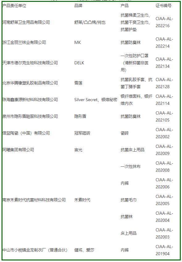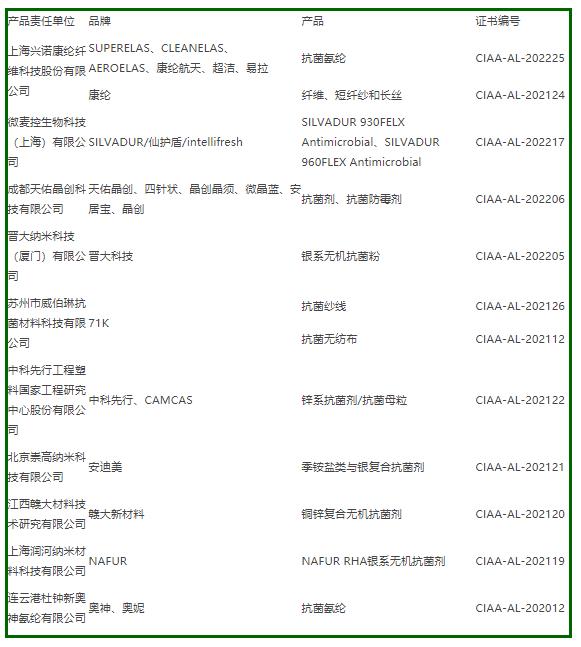 在這次發布會中,包括南京禾素時代抗菌材料科技有限公司、珠海鑫康源新材料科技有限公司、泉州市隱形盾鞋服科技有限公司、同曦集團有限公司等紡織企業的產品,成為CIAA發布的2022年度抗菌標志產品。晉大納米科技(廈門)有限公司、連云港杜鐘新奧神氨綸有限公司、北京崇高納米科技有限公司、上海興諾康綸纖維科技股份有限公司等紡織企業成為CIAA發布的2022年度合格抗菌材料供應商。