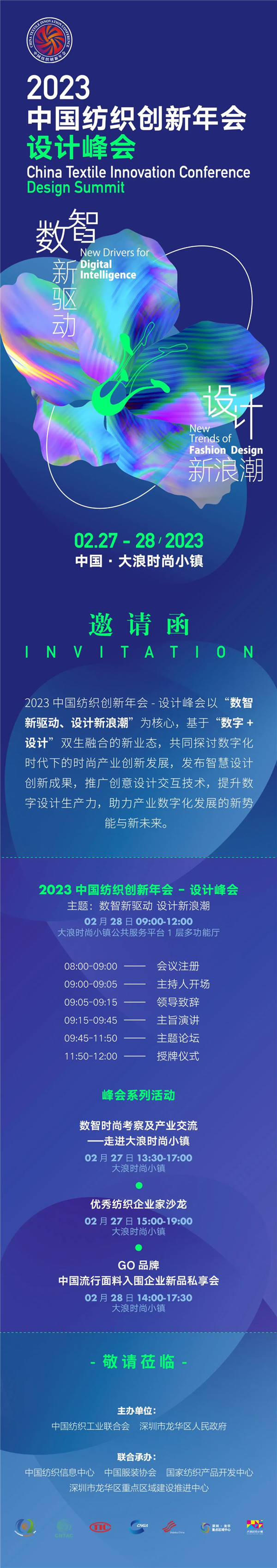 “數智新驅動,設計新浪潮”。2月27日-28日,2023中國紡織創新年會·設計峰會再度牽手深圳市龍華區大浪時尚小鎮,發布智慧設計創新成果,推廣創意設計交互技術,共同探討中國紡織行業先進數字技術與時尚創意設計跨界融合的新業態與新價值,探尋產業數字化發展的美好新未來。