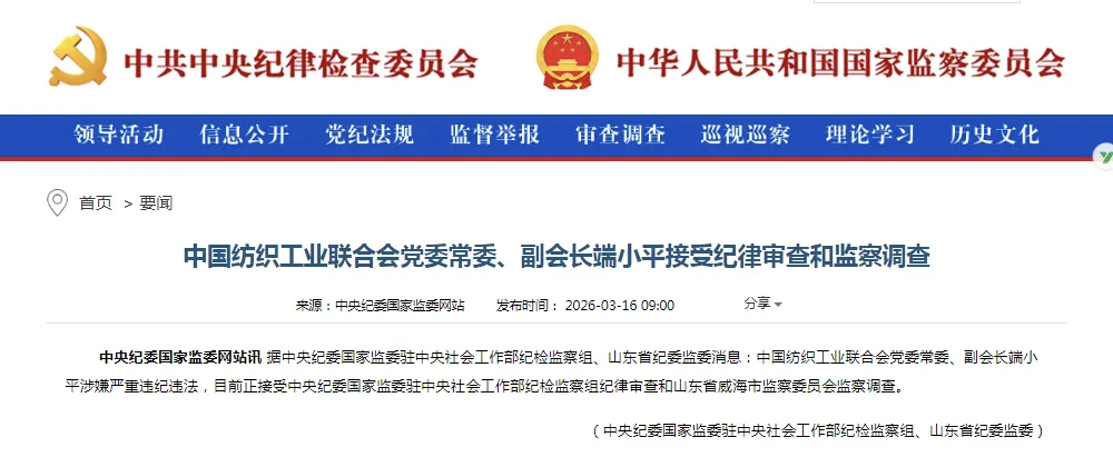 中國紡織工業(yè)聯(lián)合會黨委常委、副會長端小平涉嫌嚴重違紀違法,目前正接受中央紀委國家監(jiān)委駐中央社會工作部紀檢監(jiān)察組紀律審查和山東省威海市監(jiān)察委員會監(jiān)察調(diào)查。