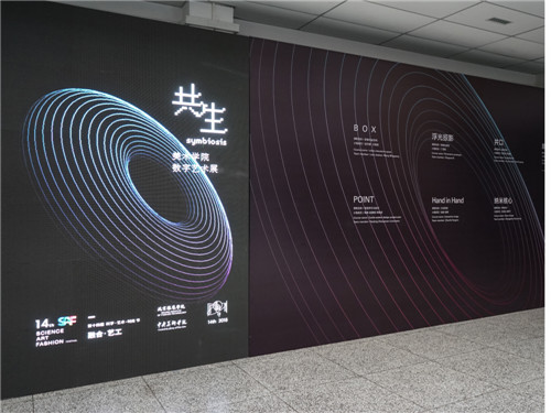 展覽于10月20日到26日在北服 圖書館一層展出。參展作品討論的主題是“共生SYMBIOSIS”,包括了年青一代對當代社會、人文、自然環境同時生存與共同發展的跨界思考,由美術學院“北京服裝學院——中央美術學院”雙培項目的16 位同學在雙校教師指導下合作完成。同學們在課程中運用互動影像、編程裝置、參數化設計等多種新技術與藝術理念相結合,向觀眾表達創作者更深層次的藝術訴求。數件展覽作品運用了素描手稿、CG 制作、交互視頻、多媒體裝置等形式,體現了“科學·藝術·時尚”在未來社會實現跨界協作的主題思想,將觀眾帶入奇幻的虛擬情景中,感受數字化藝術面對人類社會諸多問題所帶來的沖擊與思考。