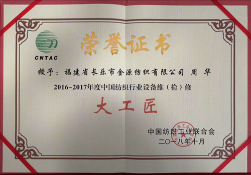 福建金源紡織在企業發展中,非常注重技術人員的培育,公司不斷涌現出行業杰出的技術人員。福建金源紡織現有員工2800余人,這其中棉紡織行業“傳承大工匠”2名,中國棉紡織行業“優秀總工程師”1名,中國紡織行業“設備維(檢)修大工匠”1名。