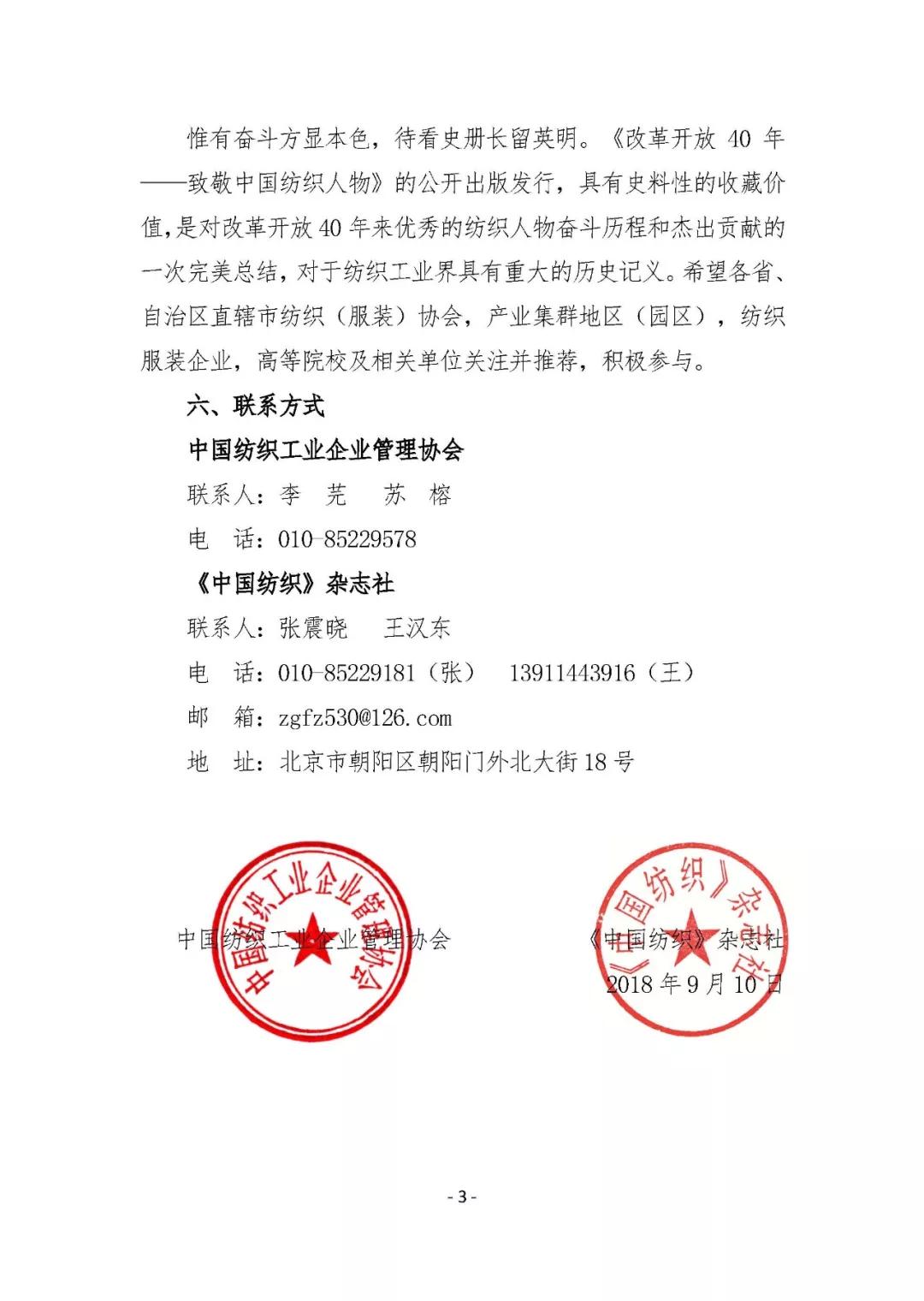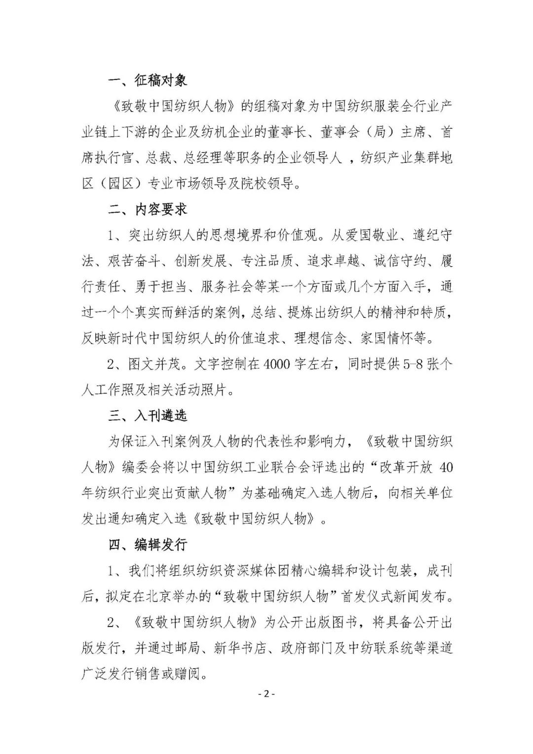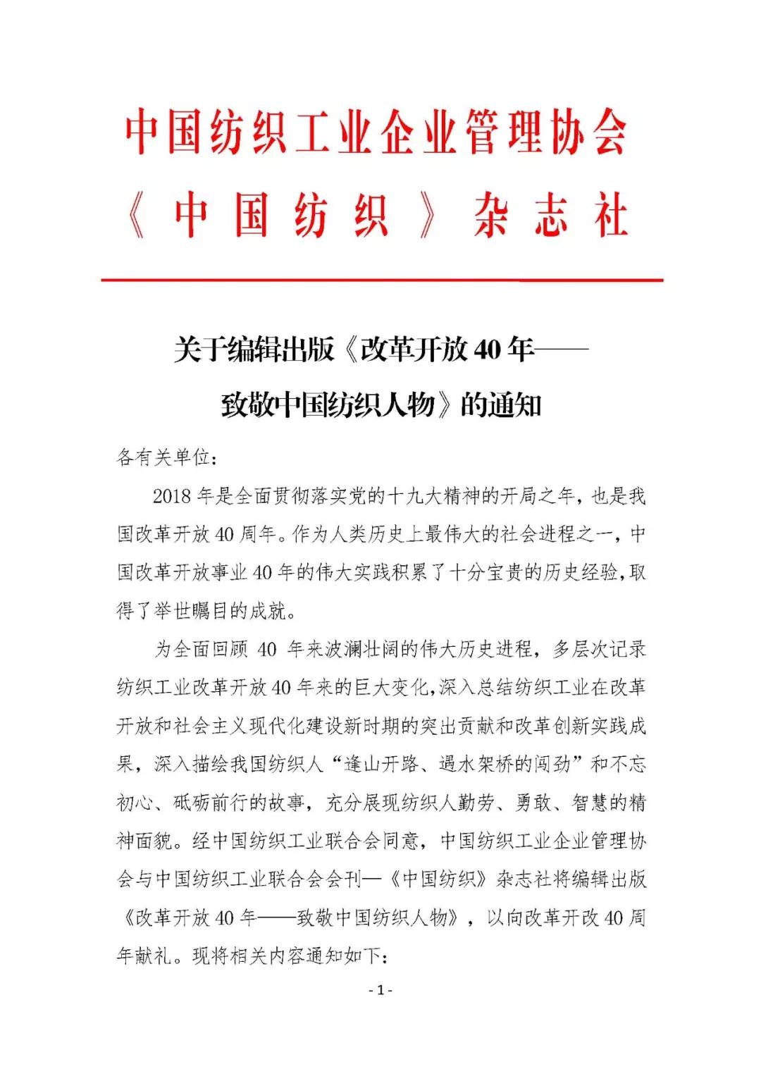 為全面回顧40年來波瀾壯闊的偉大歷史進程,多層次記錄紡織工業改革開放40年來的巨大變化,深入總結紡織工業在改革開放和社會主義現代化建設新時期的突出貢獻和改革創新實踐成果,深入描繪我國紡織人“逢山開路、遇水架橋的闖勁”和不忘初心、砥礪前行的故事,充分展現紡織人勤勞、勇敢、智慧的精神面貌。經中國紡織工業聯合會同意,中國紡織工業企業管理協會與中國紡織工業聯合會會刊—《中國紡織》雜志社將編輯出版《改革開放40年——致敬中國紡織人物》,以向改革開改40周年獻禮,F將相關內容通知如下: