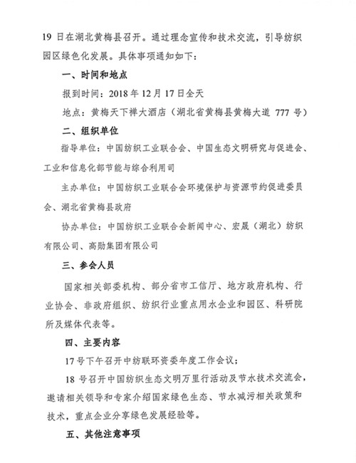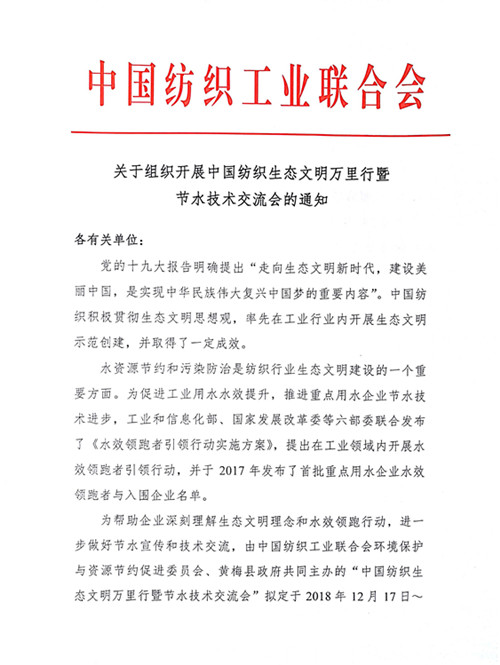 為幫助企業深刻理解生態文明理念和水效領跑行動,進一步做好節水宣傳和技術交流,由中國紡織工業聯合會環境保護與資源節約促進委員會、黃梅縣政府共同主辦的“中國紡織生態文明萬里行暨節水技術交流會”擬定于2018年12月17日~19日在湖北黃梅縣召開。通過理念宣傳和技術交流,引導紡織園區綠色化發展。具體事項通知如下: