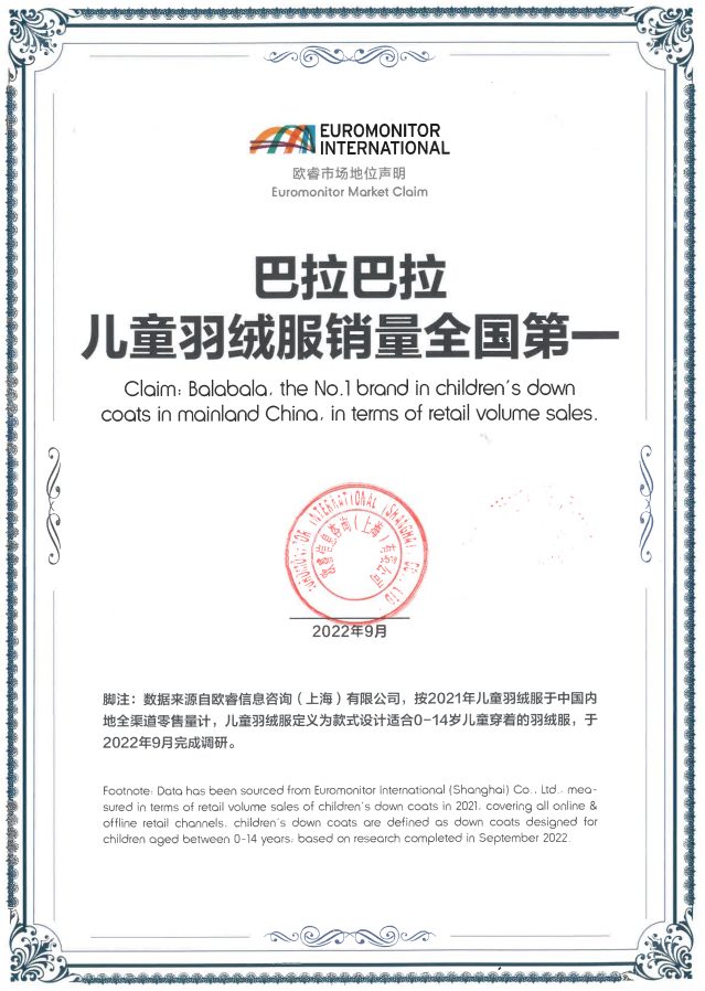 圖:2022年巴拉巴拉兒童羽絨服銷量全國第一